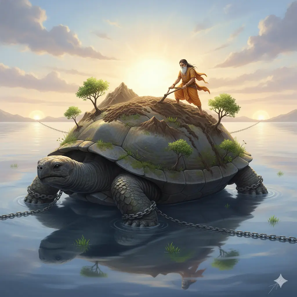 Thakur turned his gaze to the creatures of the deep. He asked the Alligator and the Crab to bring up the earth, but the moment they reached the surface, the mud dissolved in the water. The Raghop Boar tried, biting at the earth, but the soil turned to nothing in his mouth. The Earthworm, unable to stand on the water, could not complete the task.